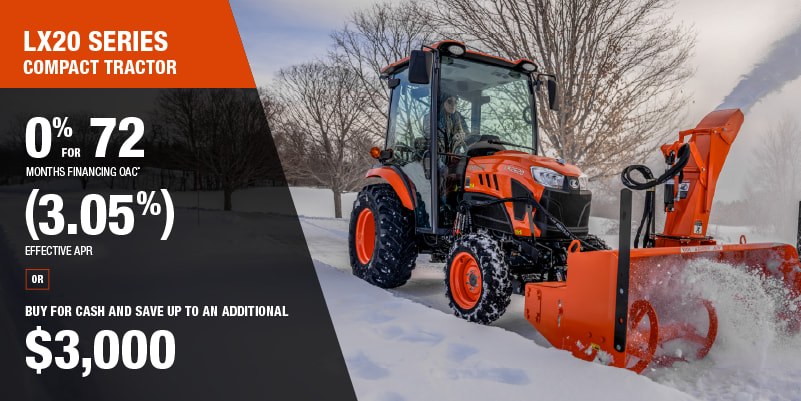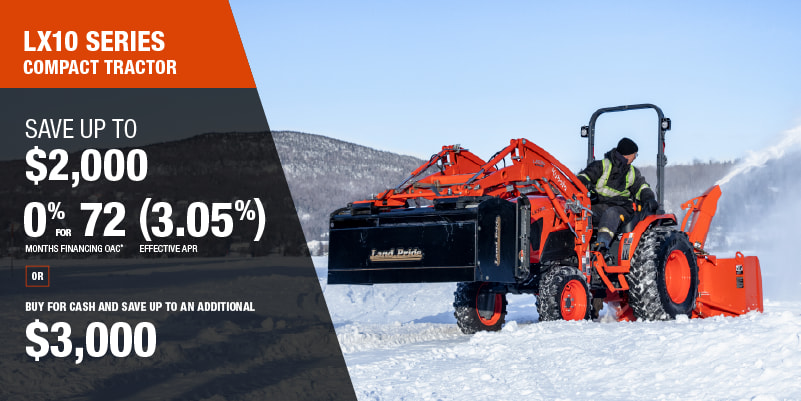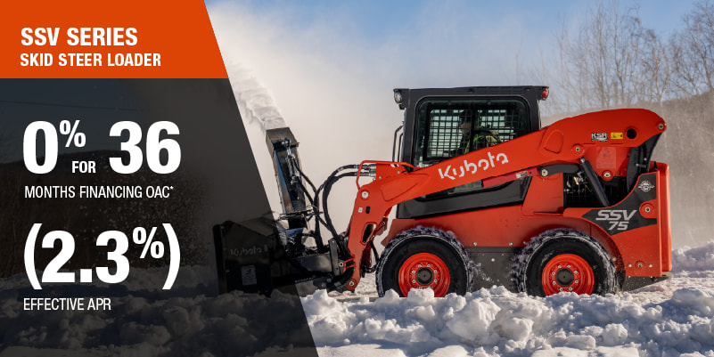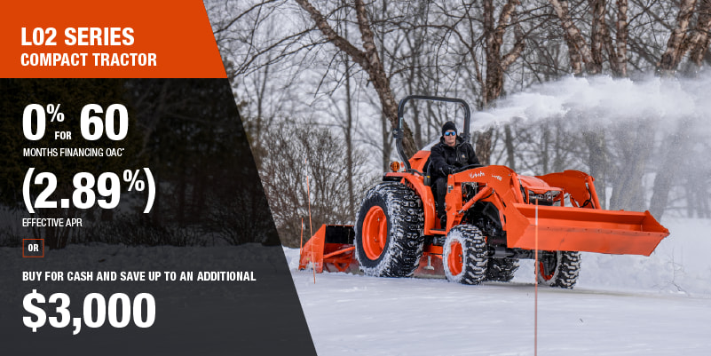 *For all offers: Prices and payments include freight and other applicable fees (including environmental fees, administration fees, set-up fees, and dealer fees). Taxes, delivery fees, insurance and registration are extra. Dealer may sell for less. Dealer order/trade may be necessary (but may not be available in all cases). Some restrictions apply. Offers valid only at participating dealers in Canada and are subject to change, cancellation or extension at any time without notice or obligation. Minimum down payment of 10% required for financing offers on turf and agricultural products. Specifications, features, illustrations and equipment shown are based on the latest available information at the time of publication. Some models are shown with optional accessories available at extra cost. Although descriptions are believed to be correct, accuracy cannot be guaranteed. We reserve the right to make changes at any time, without notice or obligation to specifications, accessories, materials, models, prices, payments and other information. Offer valid until January 12, 2026. See your participating Kubota dealer or visit www.kubota.ca for complete details.