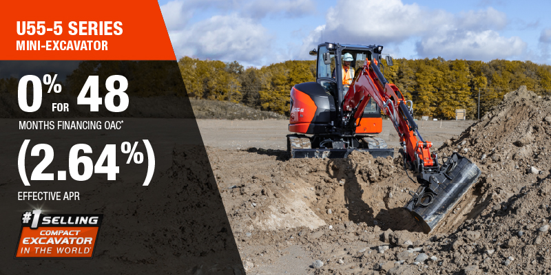 Representative finance example for the U55-5: $122,059.55 financed at 0% (2.64% effective APR which factors in $5,712.39 in non stackable cash that cannot be combined with finance offers) equals $2288.62 monthly for 48 months. $12,205.96 down payment required. Cost of borrowing is $5,712.39 for a total obligation of $122,059.55. Financing available on approved credit. Prices and payments include freight and other applicable fees (including environmental fees, administration fees, set-up fees, and dealer fees on the model specified). Excavator Claim: "Kubota is the world’s #1 selling compact excavator for 20 years." Disclaimer: According to 2023 data from Off-Highway Research including all Kubota Group brand sales. Offer valid until 01-12-2026.